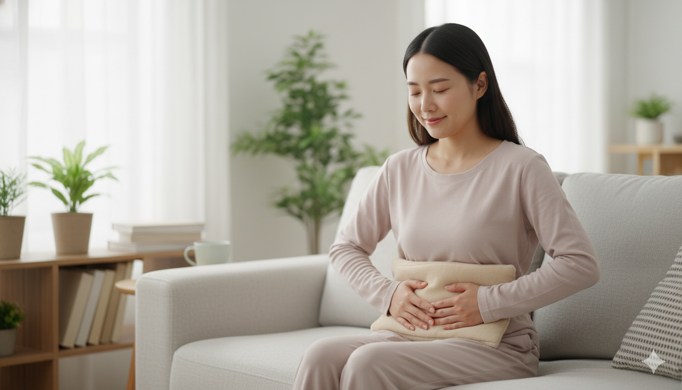 뻐근하게 아플 땐 따뜻한 찜질팩을 아랫배에 대거나 따뜻한 물로 샤워해서 긴장된 근육을 풀어주세요.